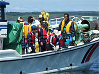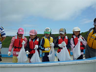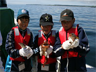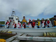 浜辺博さんの第88敬運丸と落石漁協指導船「おちいし」の2隻で、ユルリ島周辺に設置した「たこかご」引揚作業を行いました。かごに入っている生きた魚を触れて楽しんでいました。