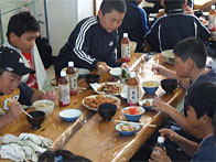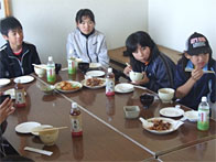 エトピリ館にて「海鮮工房 霧娘」の方々に指導してもらいながら、慣れない手つきで加工・料理体験を行いました。昼食では、自分達が作った料理を美味しそうに食べていました。