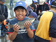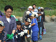 昼食後は三里浜海岸において、地引網体験を行い小学生が力いっぱい網を引き揚げ、網に入った珍しい魚を触れていたり、生きた魚を手に持ったりするなどして喜んでいました。