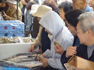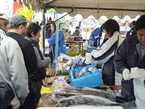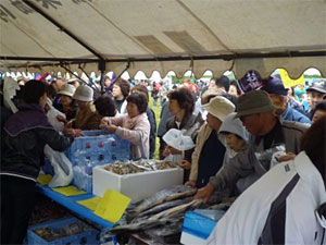 当日は、晴れていましたが気温が低く少し肌寒さがありました。しかし、午前10時00分の販売開始前から漁協販売ブースには大勢のお客さんが訪れ、長い行列ができ販売開始の合図を待っていました。