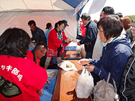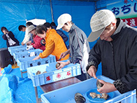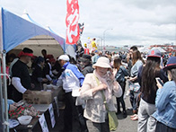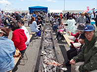 物販コーナーでは、販売開始の30分前から各物販テント前に人が並び、浜値で販売される落石の海産物を購入しようと大勢の人で賑わっておりました。 炭火焼きコーナーでは、物販テントで購入した魚貝類や食材を焼くことができ、大勢の人が新鮮な魚貝類をその場で焼いて食べている姿がありました。