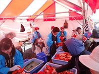 イベントでは、ホッキ貝早剥き競争が行われ、1分間でどれだけホッキの殻を剥けるか競い、地元の人や観光で訪れた人が挑戦しました。悪戦苦闘しながら剥く挑戦者もおり、貝の中の身に傷をつけないようにするために苦労していました。