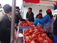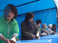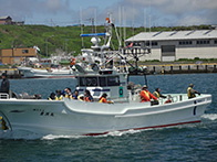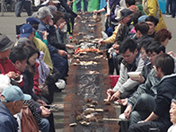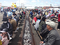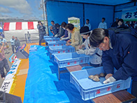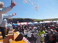 平成28年6月5日(日)に落石漁港中央埠頭にてマリンポートフェスティバル「第9回おちいし・味まつり」が開催されました。当日は、肌寒い曇り空でしたが約3,500人の人が会場に訪れました。落石ネイチャークルーズ協議会によるユルリ・モユルリ島周遊航行も運航され、乗船者は落石の自然や海鳥の観察などを楽しんでおりました。物販コーナーでは、販売開始の30分前から各物販テント前に人が並び、浜値で販売される落石の海産物を購入しようと大勢の人で賑わっておりました。炭火焼きコーナーでは、物販テントで購入した魚貝類や食材を焼くことができ、大勢の人が新鮮な魚貝類をその場で焼いて食べている姿がありました。イベントでは、ホッキ貝早剥き競争が行われ、1分間でどれだけホッキの殻を剥けるか競い、地元の人や観光で訪れた人が挑戦しました。悪戦苦闘しながら剥く挑戦者もおり、貝の中の身に傷をつけないようにするために苦労していました。最後には、餅まき抽選会が盛大に行われ、抽選券が入っている餅を拾い、景品を手にして喜ぶ姿が見られるなど大盛況のうちに終えることができました。
