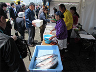 開始時間よりも前に物販コーナーには大勢のお客様が並んでおり、開始とともに落石産の海産物を購入されていました。